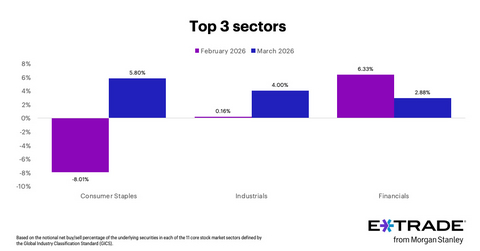 E*TRADE from Morgan Stanley today released the data from its monthly sector rotation study, which indicates whether clients were net buyers or sellers in each of the 11 core stock market sectors defined by the Global Industry Classification Standard (GICS). These figures, which encompass activity in all US-traded stocks (including OTC) and ADRs, reflect purchases and sales of the individual stocks in each sector, as well as dividend investments and options exercises and assignments.